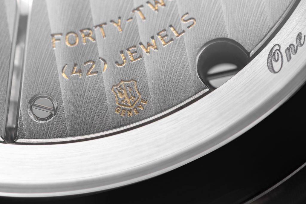 The caseback is engraved with Poinçon de Genève motif, a hallmark awarded exclusively to select watchmaking creations that meet strict criteria of excellence in artistry and mechanical mastery.