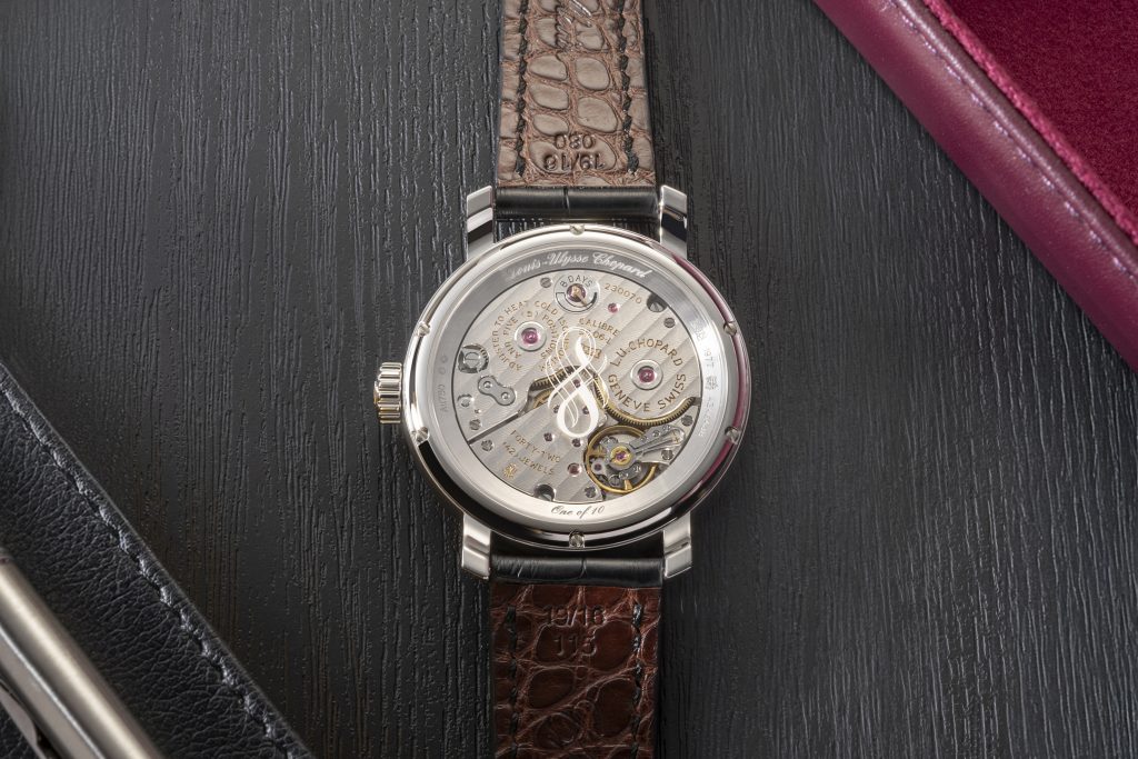 The caseback of the L.U.C Quattro Spirit 25 Sincere Platinum Jubilee Edition reveals intricate detailing, including Sincere’s 70th anniversary logo etched onto the sapphire crystal as a tribute to this milestone. This special touch, and the engraving, ‘One of 10,’ serves as a reminder of the timepiece’s exclusivity and commemorative significance.