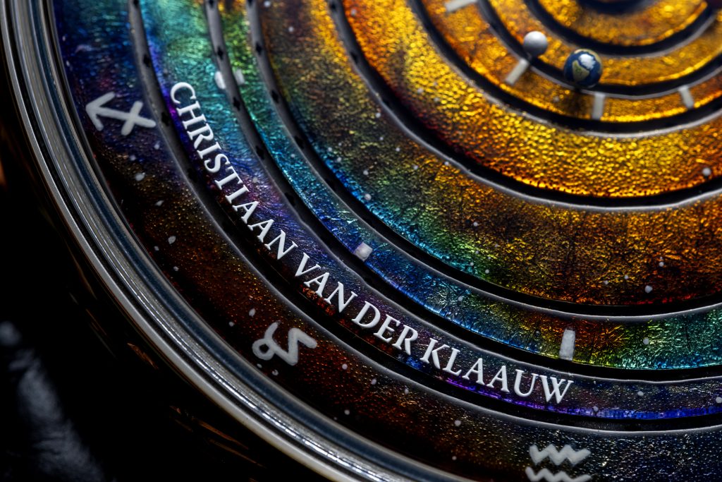 The beautiful oil painted dial by artist Gaël Colon, inspired by an early prototype of the CVDK Grand Planetarium Eccentric Manufacture.