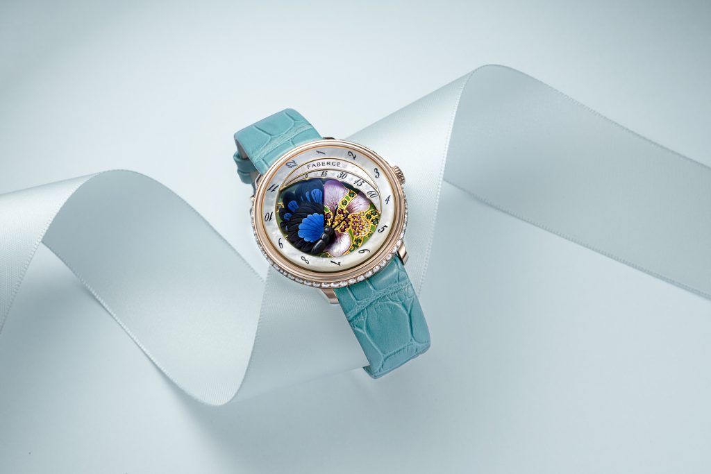 The vibrant dial of the Fabergé Compliquée Butterfly Tropics Sincere Platinum Jubilee Edition features a hand-painted butterfly and orchid, framed by diamonds, sapphires and an exquisite mother-of-pearl hour ring.