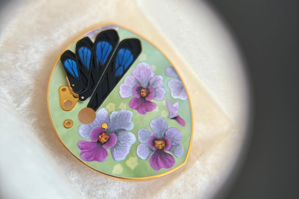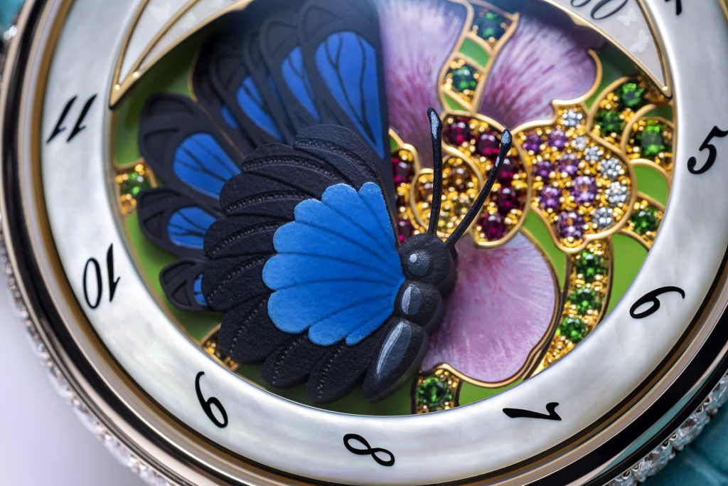 Adding to its allure, the watch features an exquisite mother-of-pearl hour ring that frames a hand-painted orchid in a mesmerizing gradient of purple. Perched delicately on the orchid is a butterfly, masterfully painted in elegant shades of blue and black. The design is a marvel of craftsmanship, where the butterfly’s wings, which gracefully move to indicate the passing minutes—a moment of delicate beauty, captured in time and animated with each passing hour.