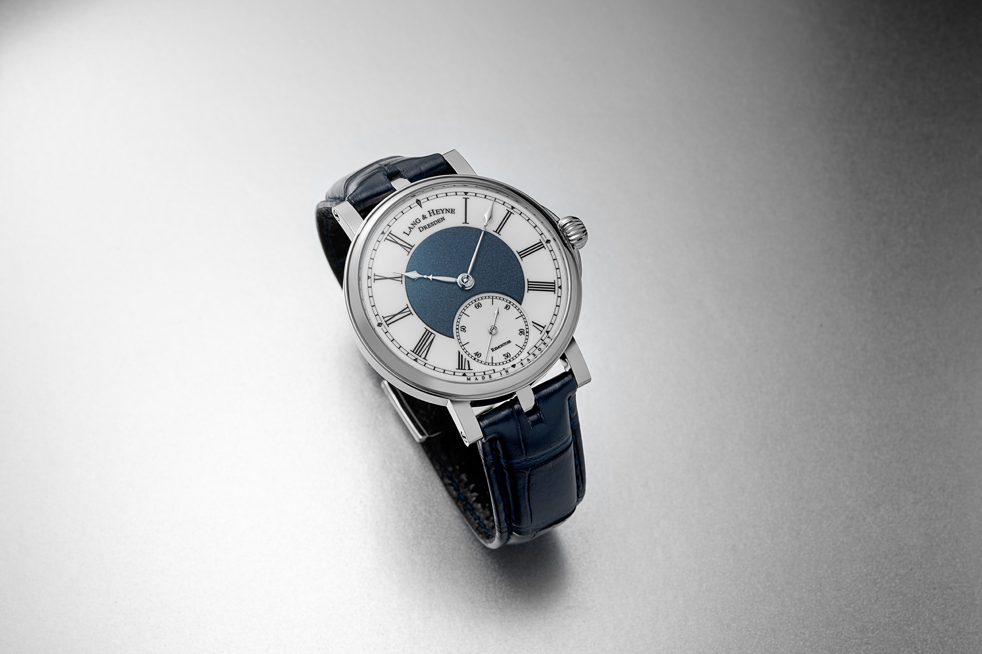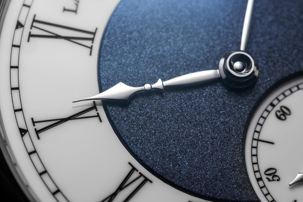 The Lang & Heyne Friedrich III Remontoir Sincere Platinum Jubilee Edition features a ceramic dial with a sand-blasted royal blue silver decorative plate at the center.