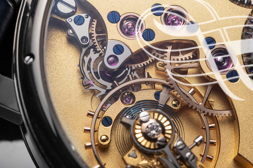The Remontoir operates by incorporating an intermediate energy accumulator that is regularly re-tensioned by the movement of the gear train. When the primary energy source – the mainspring, transfers its energy to the watch’s wheel chain, the Remontoir’s locking mechanism temporarily halts this energy flow, redirecting it into an intermediate spring. This intermediate spring then powers the remaining gears up to the escapement, which regulates timekeeping. A control element moving with the gear train activates the locking mechanism at regular intervals, ensuring a steady and precise release of energy. This process not only keeps the watch running smoothly but also results in a jumping seconds display on the dial.