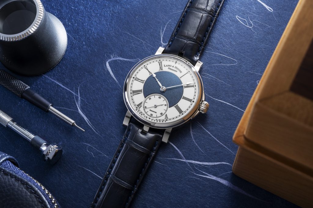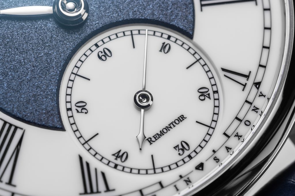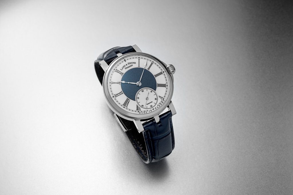 The Lang & Heyne Friedrich III Remontoir Sincere Platinum Jubilee Edition employs a three-part dial concept, where the seconds subdial