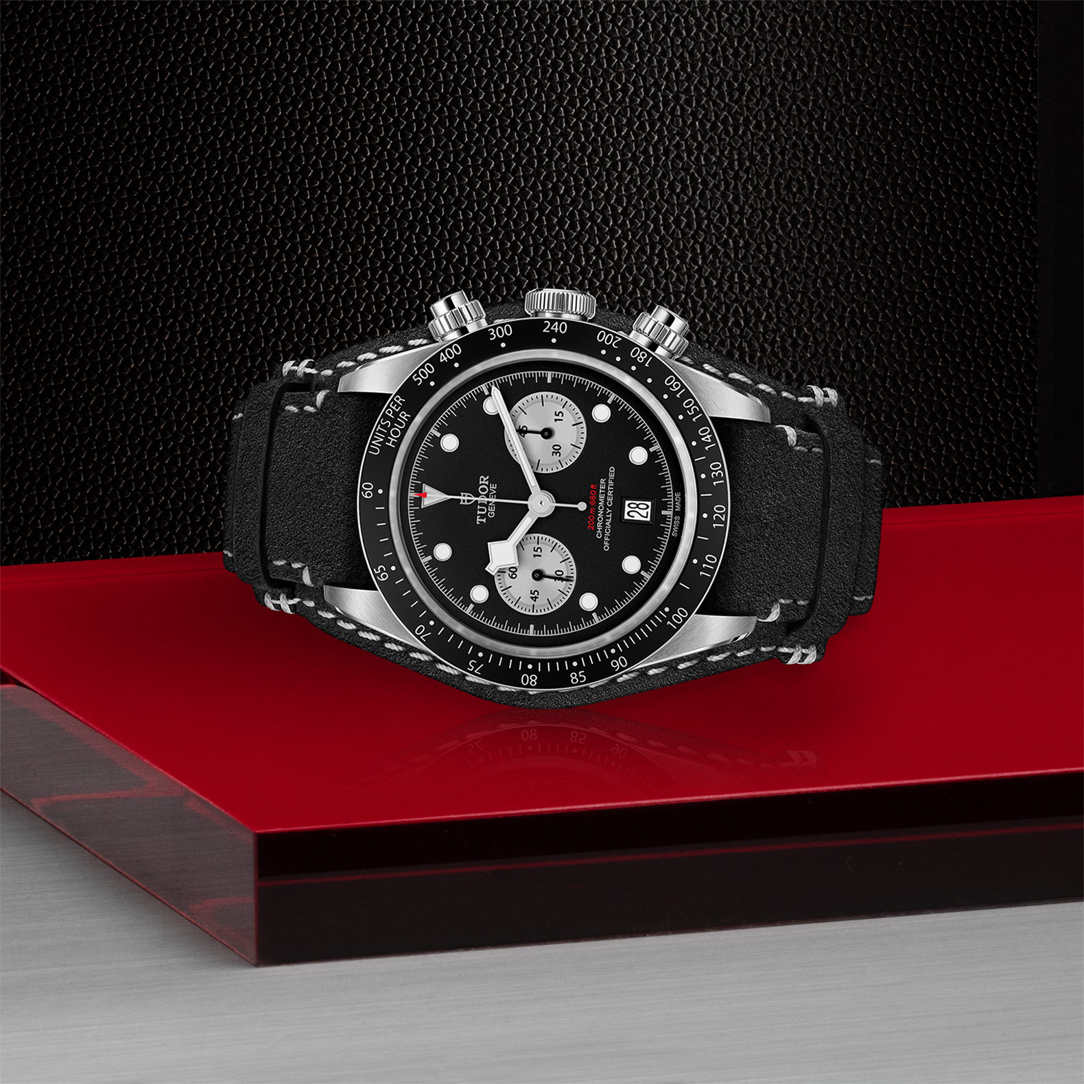 In 1970, TUDOR introduced its first chronograph, the Oysterdate. A watch that was both robust and functional, its unique design was characterised by its bright colours, its pentagonal hour markers shaped like a baseball home plate, its 45-minute counter and its date function at 6 o’clock. Immediately adopted by the world of motorsport, it paved the way for more than 50 years of technical chronographs that TUDOR has never stopped improving.