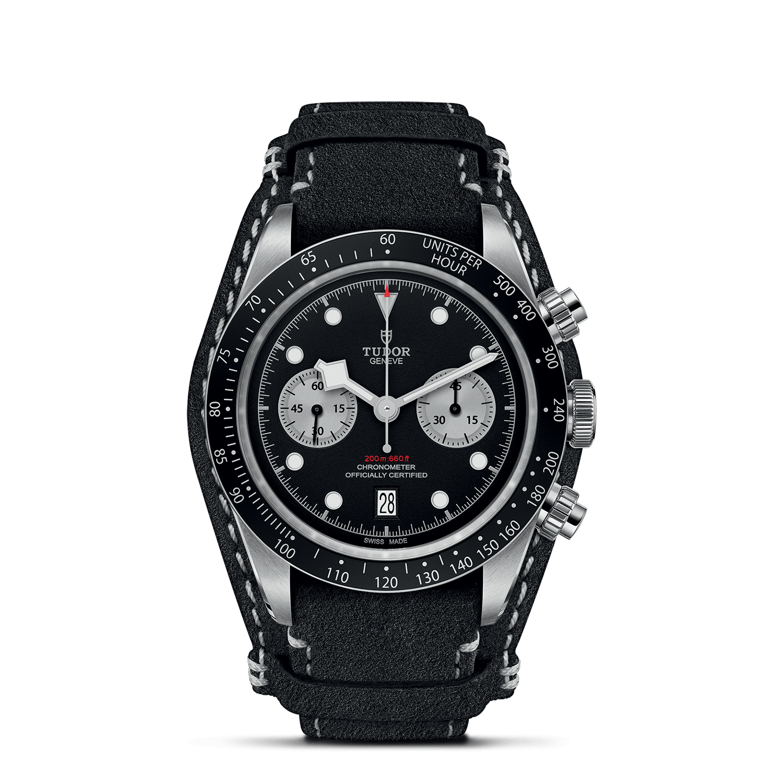 The Black Bay Chrono model combines these traditions in a sports chronograph for purists, with contrasting sub-counters and a high-performance automatic Manufacture Calibre, with column wheel and vertical clutch.