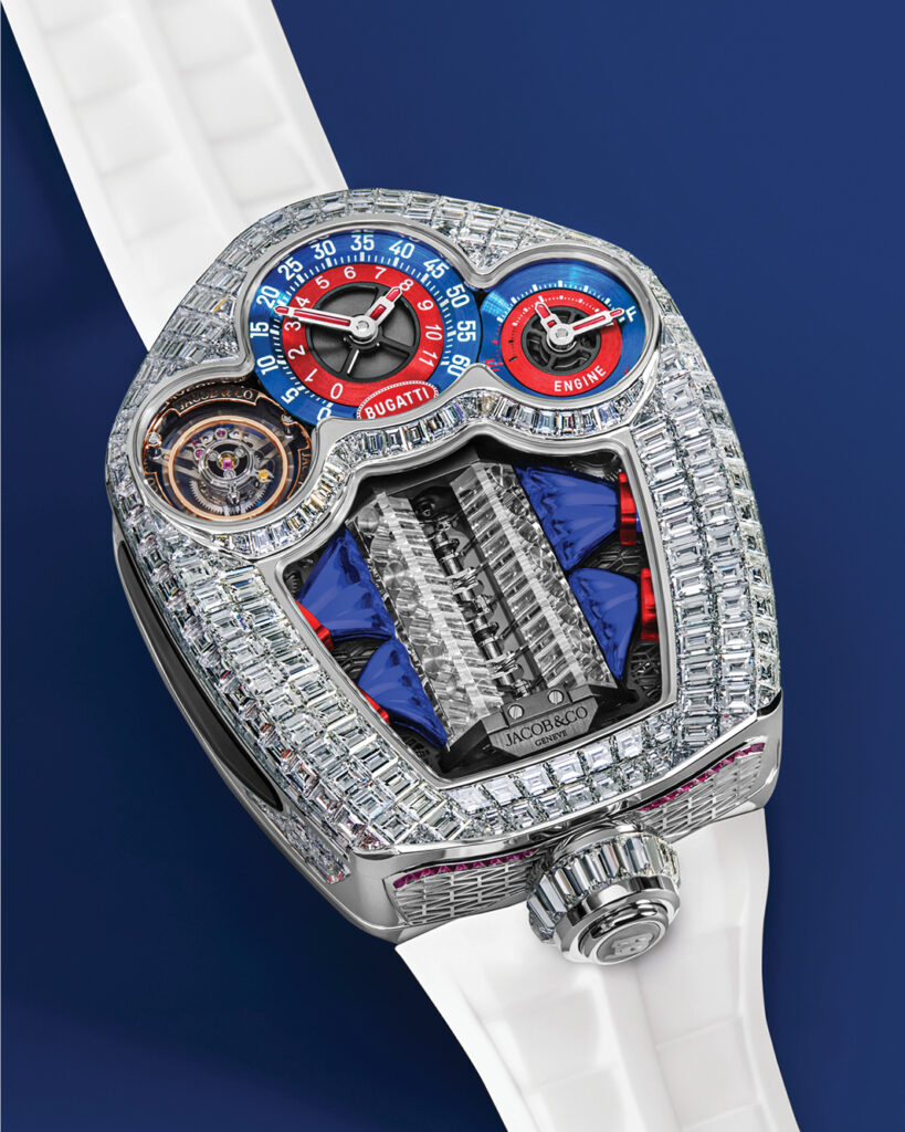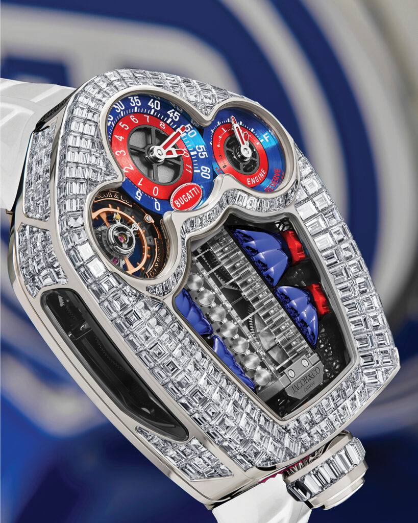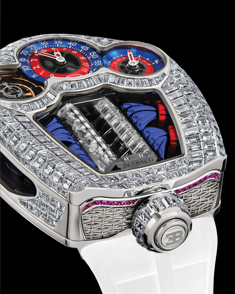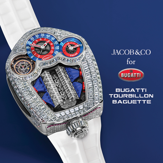 The Jacob & Co. Bugatti Tourbillon is the hypertwin to Bugatti’s hyper sports car of the same name. Featuring new inventions, complications, and architecture inspired by Bugatti, the watch and automobile are aesthetically, mechanically, and functionally integrated like never before, achieving unprecedented accuracy and likeness.