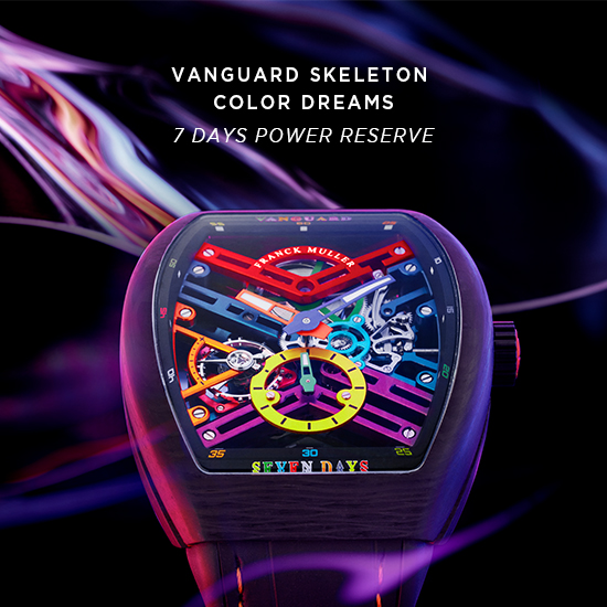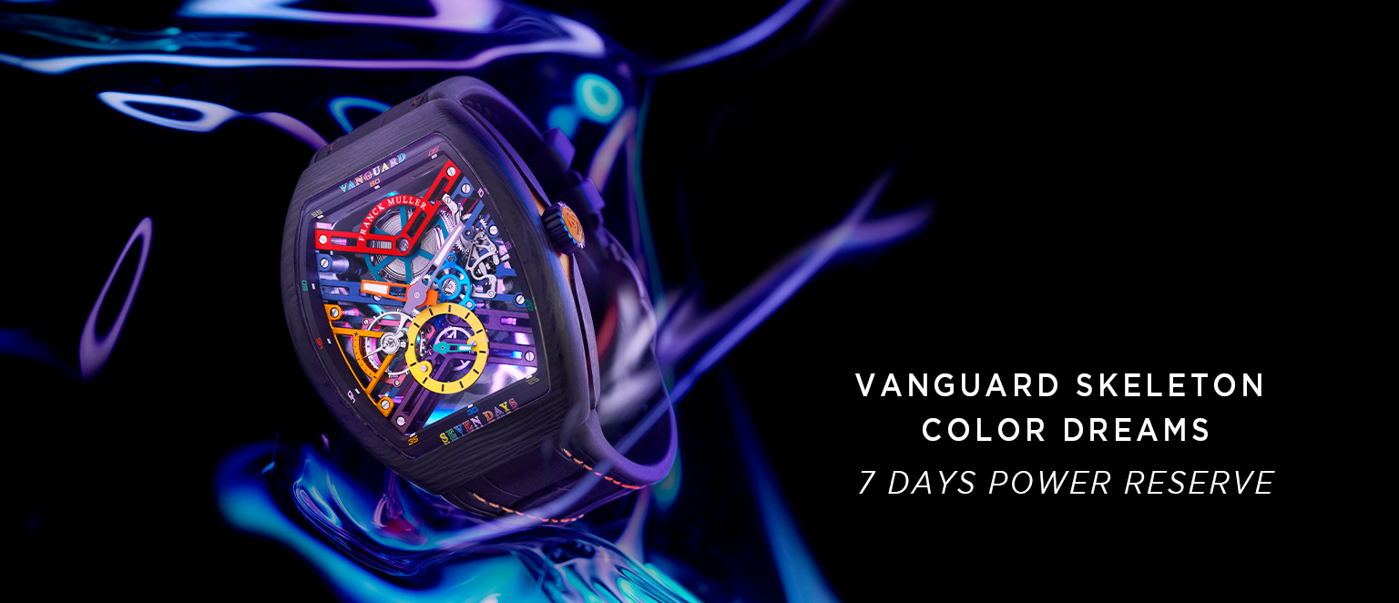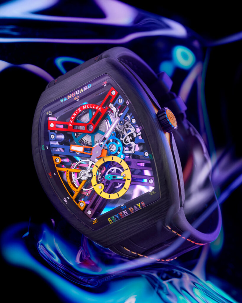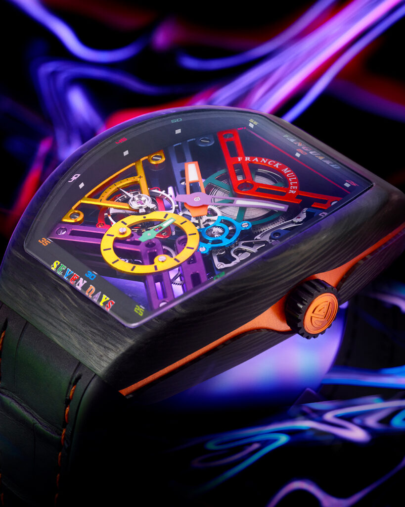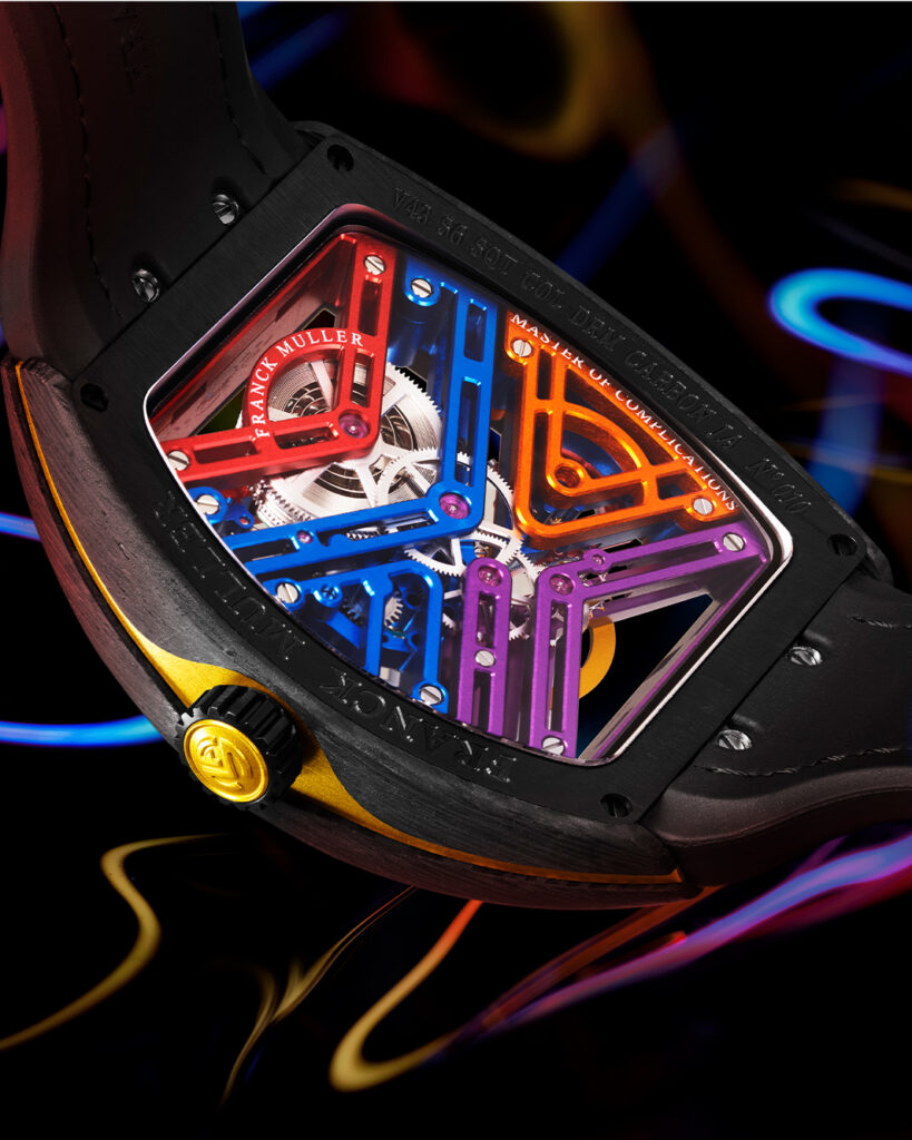 The psychedelic dials of the V43 Vanguard Skeleton Color Dreams are a signature of the House. The satin-finished, anodised aluminium bridges are secured directly to the lightweight Carbotech case, machined precisely to fit the curved design. Architectural inspiration merges with vivid pop colours on the electroplated movement components, from a fiery red barrel bridge to a marigold yellow small seconds counter at 6 o’clock.