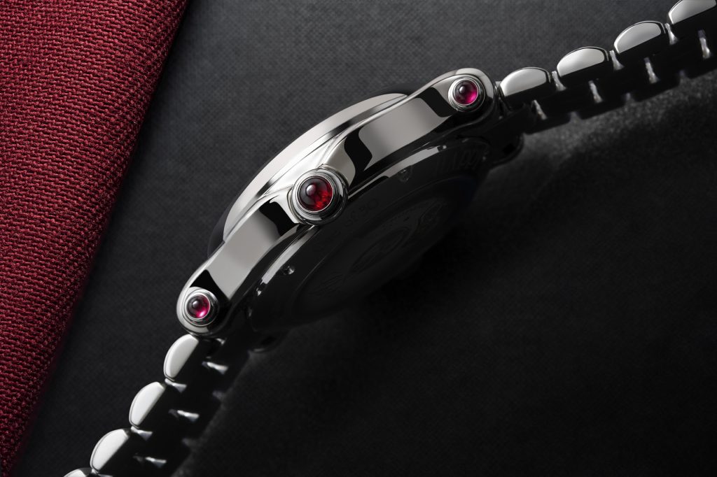 The case and ‘pebble-link’ bracelet of the Chopard Happy Sport The First Sincere Platinum Jubilee Edition are made of Lucent Steel™, an anti-allergenic alloy that combines anti-allergenic virtues with the brightness and sturdiness of ordinary steel.