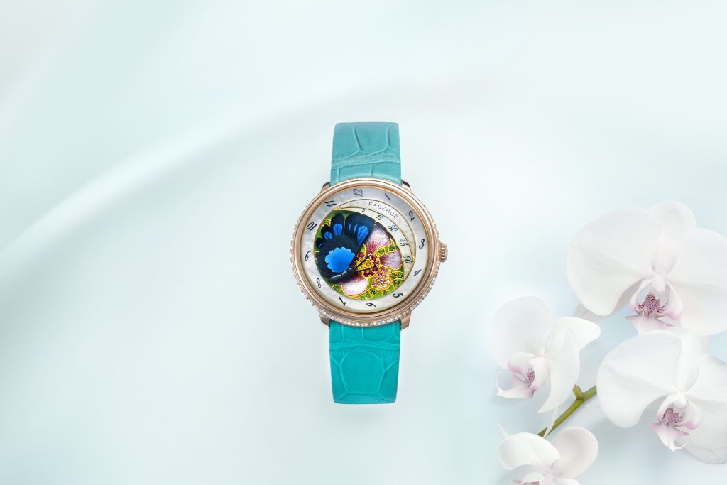 The vibrant dial of the Fabergé Compliquée Butterfly Tropics Sincere Platinum Jubilee Edition features a hand-painted butterfly and orchid, framed by diamonds, sapphires and an exquisite mother-of-pearl hour ring.