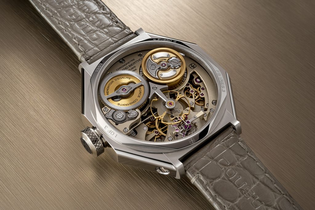 The caseback reveals the mechanical intricacies of the FB 1RES.3’s movement combining a fusee-and-chain transmission with a one-second remontoire.