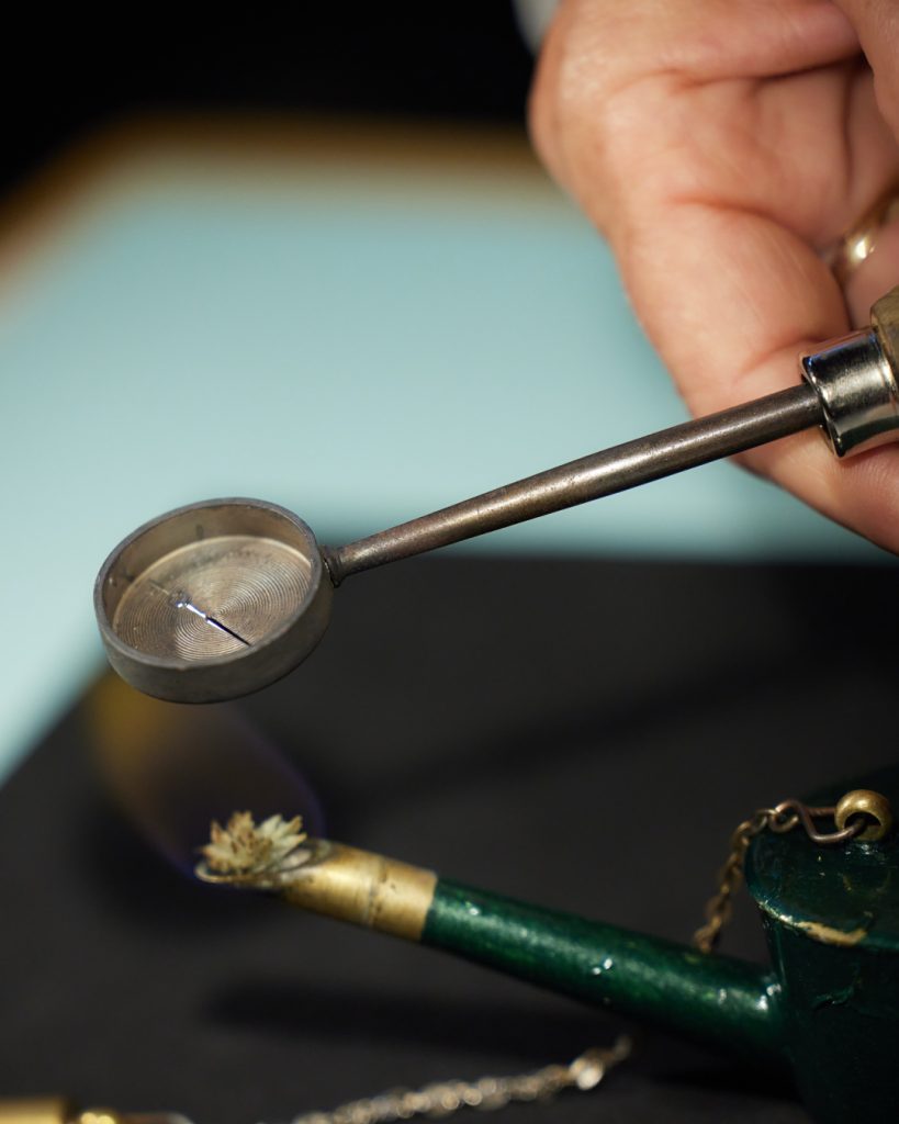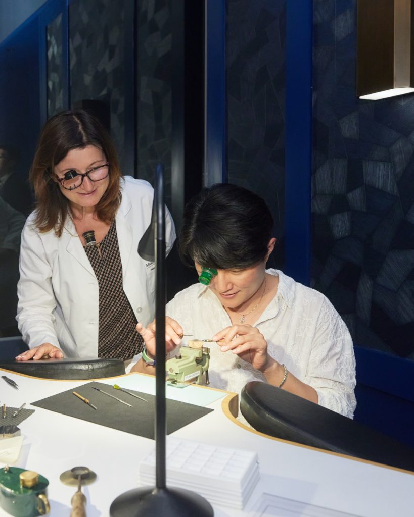 An esteemed guest tries her hand at polishing watch hands during the Moritz Grossmann launch event.