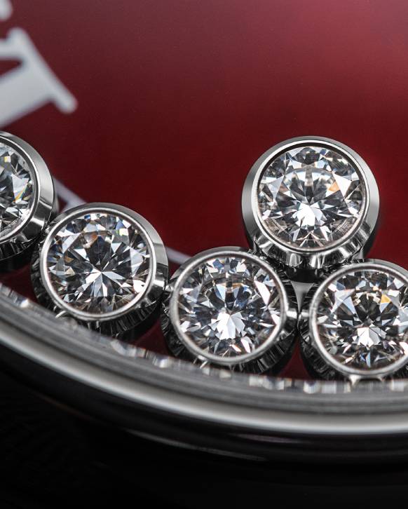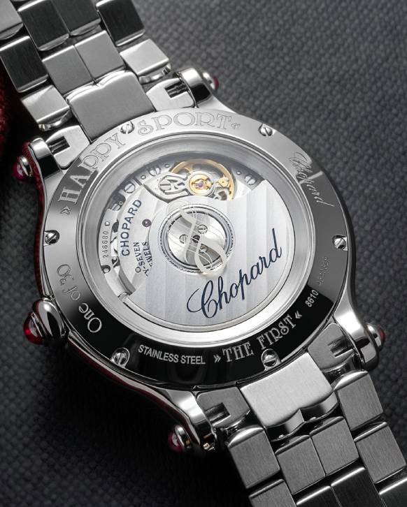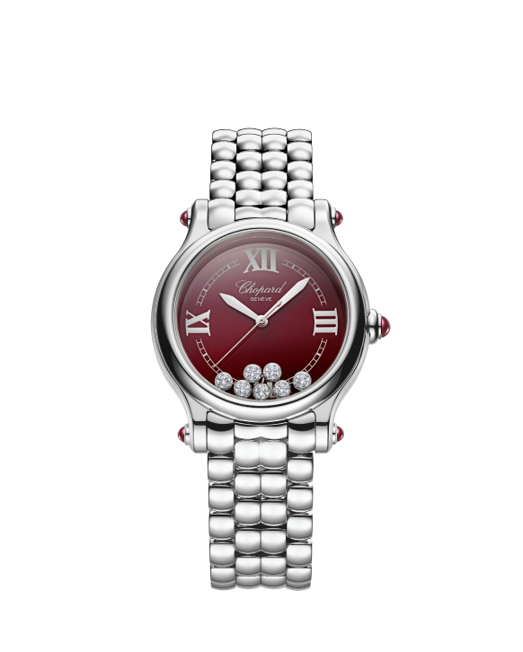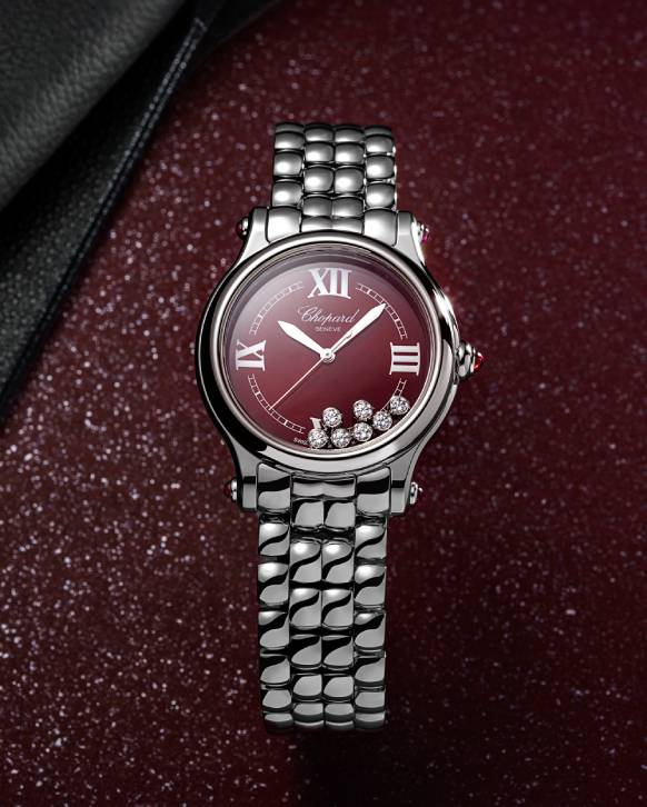 The Chopard Happy Sport The First Sincere Platinum Jubilee Edition, a limited edition with only 30 pieces produced, features a burgundy dial adorned with Roman hour-markers—a first for the Happy Sport collection. Against this distinct dial, seven constantly moving diamonds create a mesmerizing and ever-changing spectacle, offering a continually evolving experience for their wearer.