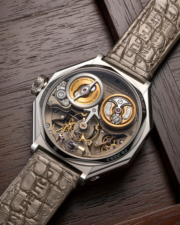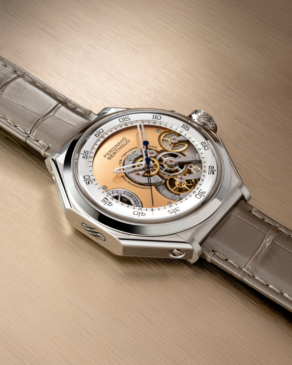 This exceptional timepiece features the exclusive use of platinum in its distinctive octagonal case, complemented by a unique satin-brushed salmon dial and is powered by the celebrated Calibre FB-RES.FC, an intricate movement combining a fusee-and-chain transmission with a one-second remontoire to ensure consistent energy delivery and precision.