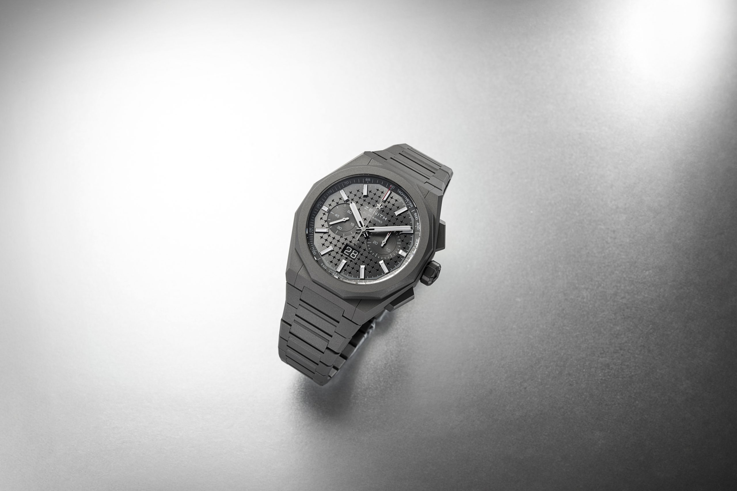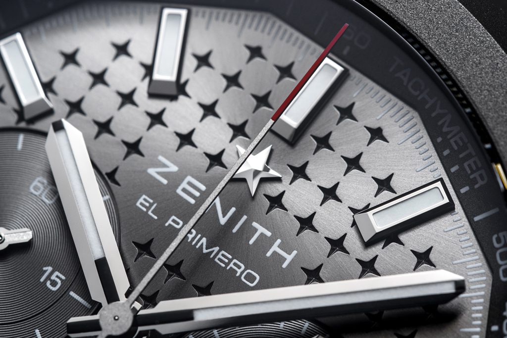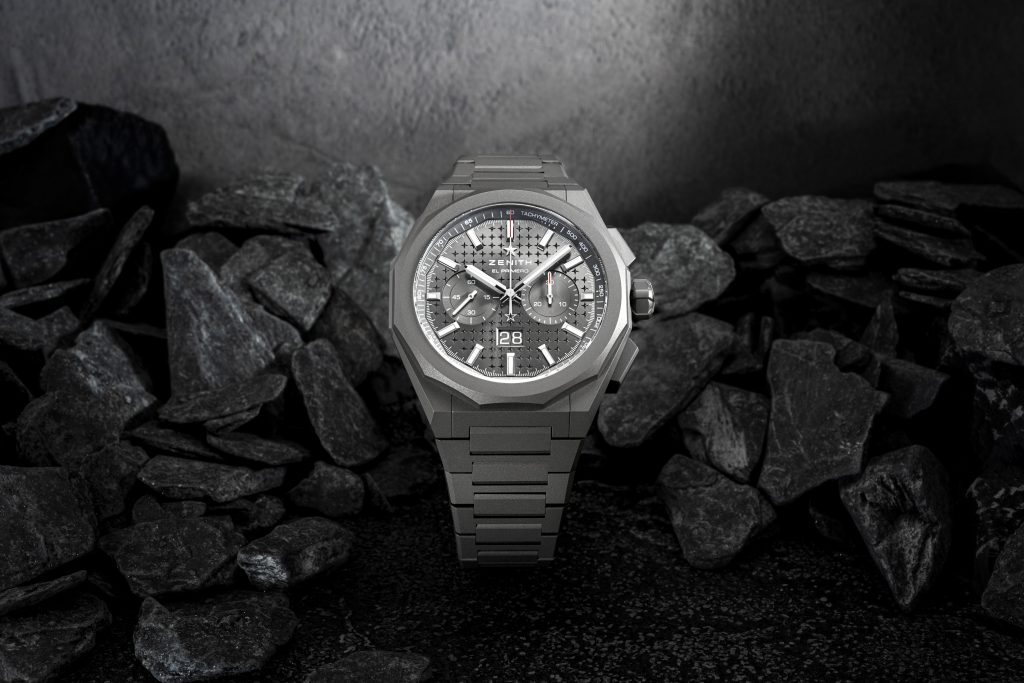 The deep grey tones of titanium enhance the timepiece’s raw, monolithic presence, while the tachymeter scale on the flange ring seamlessly follows the contours of the dodecagonal bezel. The monochromatic design is completed by a sunburst-patterned, satin-finished dial in matching metallic grey, and adorned with an engraved starry sky pattern. This design, inspired by the “Double Z” ZENITH star logo found on the earliest DEFY wristwatches dating back to 1969, bridges the past and present, paying tribute to both ZENITH’s horological heritage and Sincere’s journey of excellence.