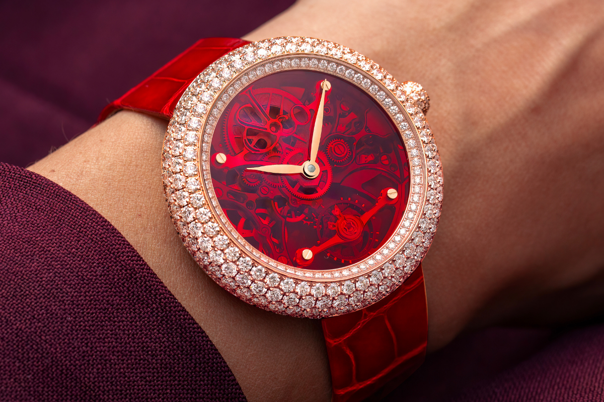 Crafted in warm rose gold and accented with a vivid red mineral crystal dial, the Jacob & Co. Brilliant Skeleton Northern Lights transforms light and colour into a radiant presence. Its sculptural form is accentuated through a constellation of gem-set brilliance. At its heart, a finely crafted skeletonised movement anchors the piece, where precision offers a measured counterpoint to its bold, romantic character.