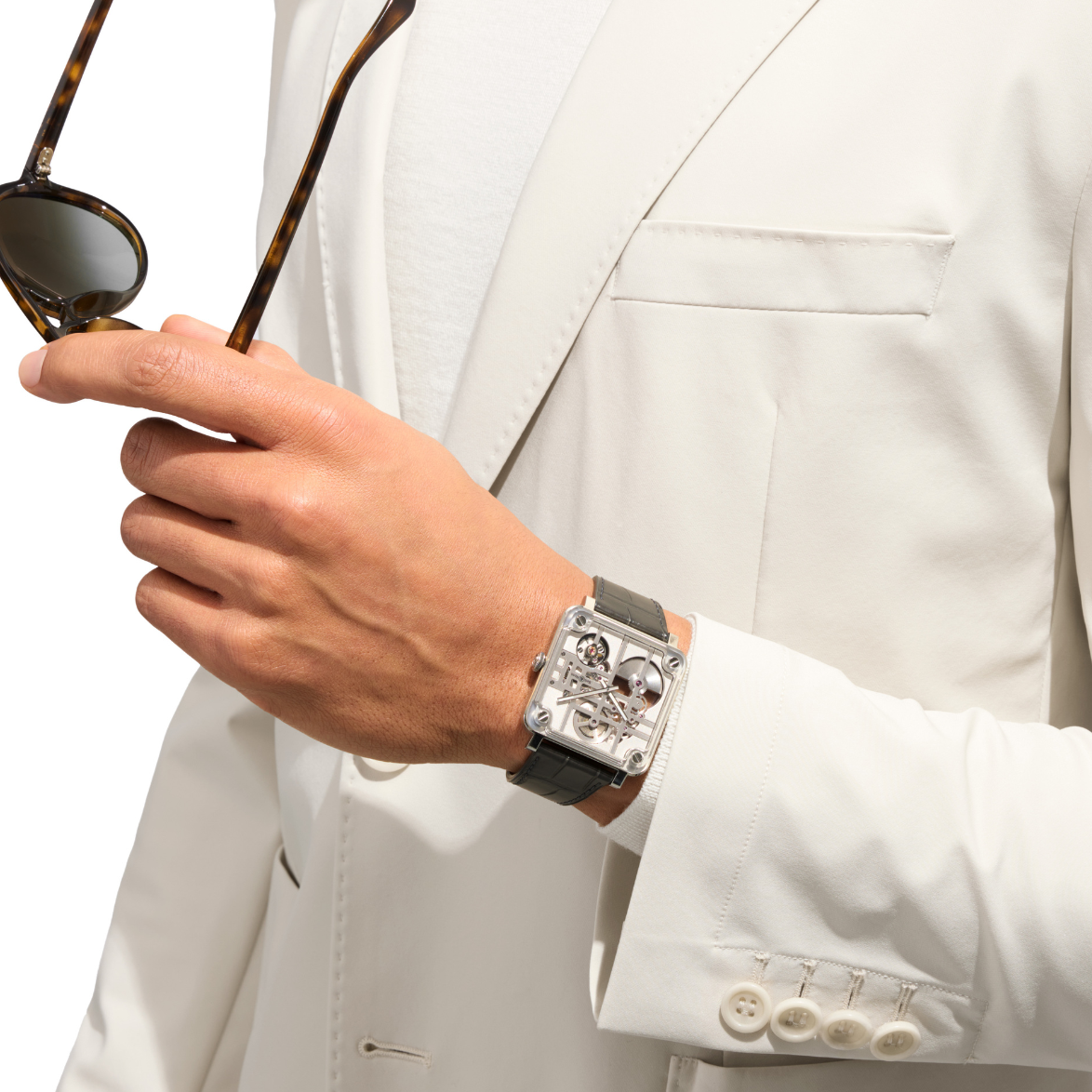 Bell & Ross presents the limited BR-X3 Micro-Rotor, where the iconic square case becomes the movement’s structure. Built around a central steel plate framed by sapphire crystals, it reveals a minimalist, transparent architecture. Powered by Calibre BR-CAL.390 with micro-rotor, it delivers a 48-hour power reserve within a slim 9mm profile.