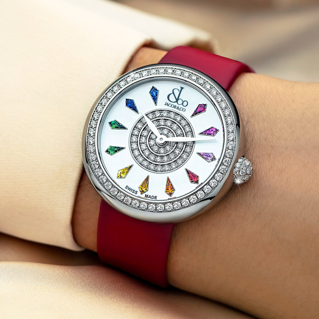 In 2017, Jacob & Co. created a new ladies’ collection that looked like no other. Round, without lugs, with a strap directly attached to the case, Brilliant was designed to be versatile, precious and to embrace the entire range of gems Jacob & Co. loves.