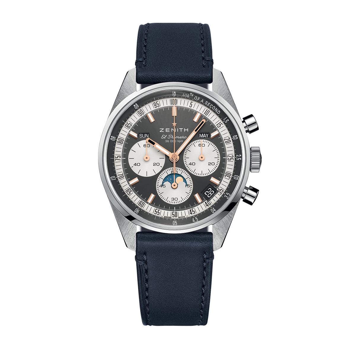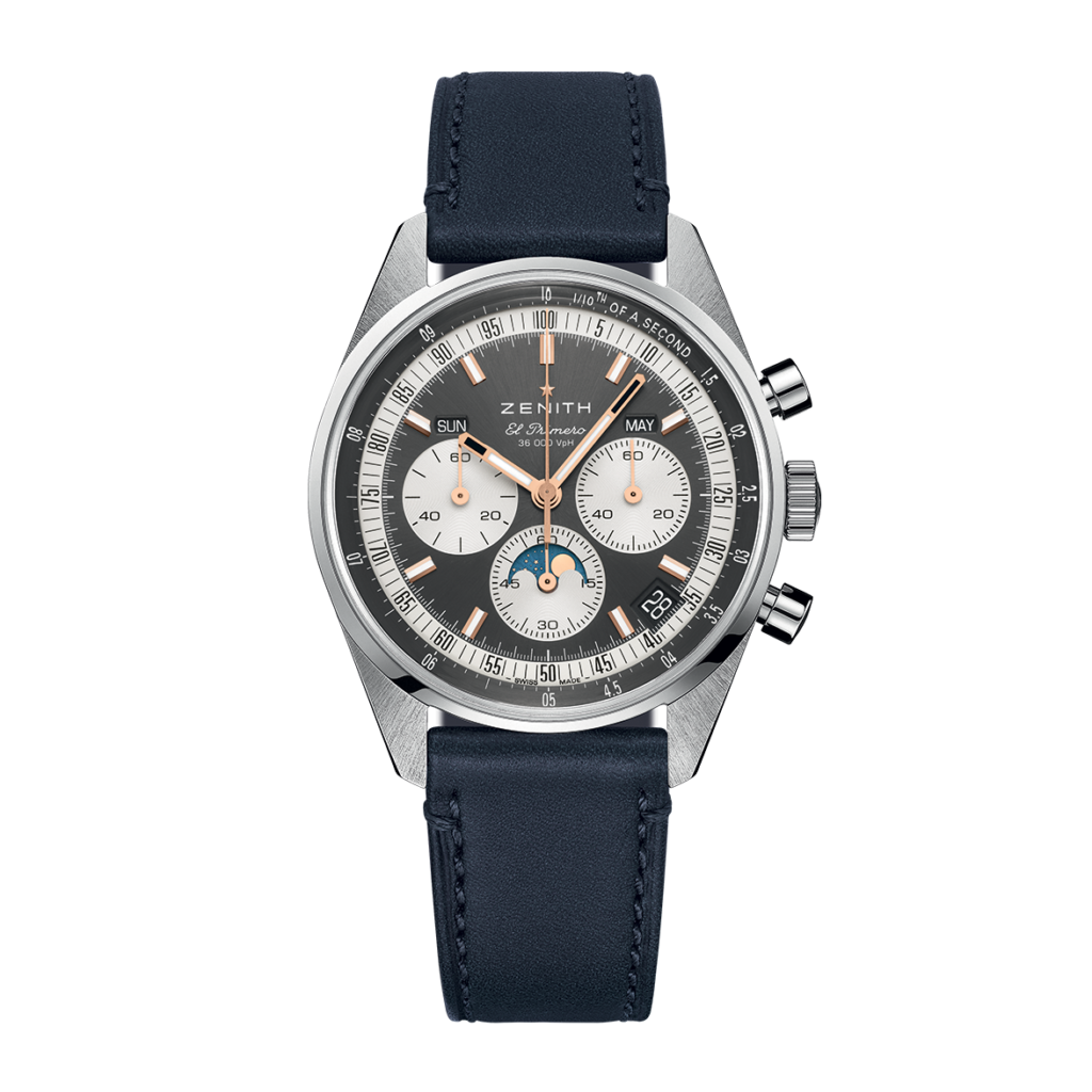 The CHRONOMASTER Original Triple Calendar is crafted in a 38mm steel case with blue calfskin strap, paired with a sunburst slate-grey dial displaying the day, date, month and moonphase. It is powered by the El Primero 3610 automatic high-frequency chronograph movement with a 1/10th of a second chronograph function and a provides a power reserve of 60 hours.