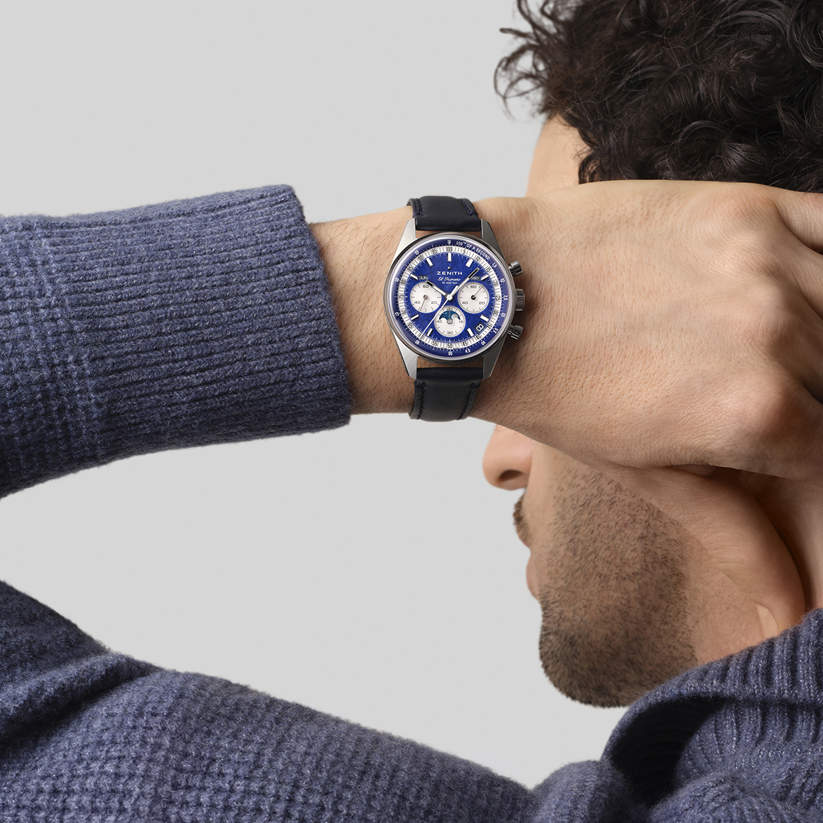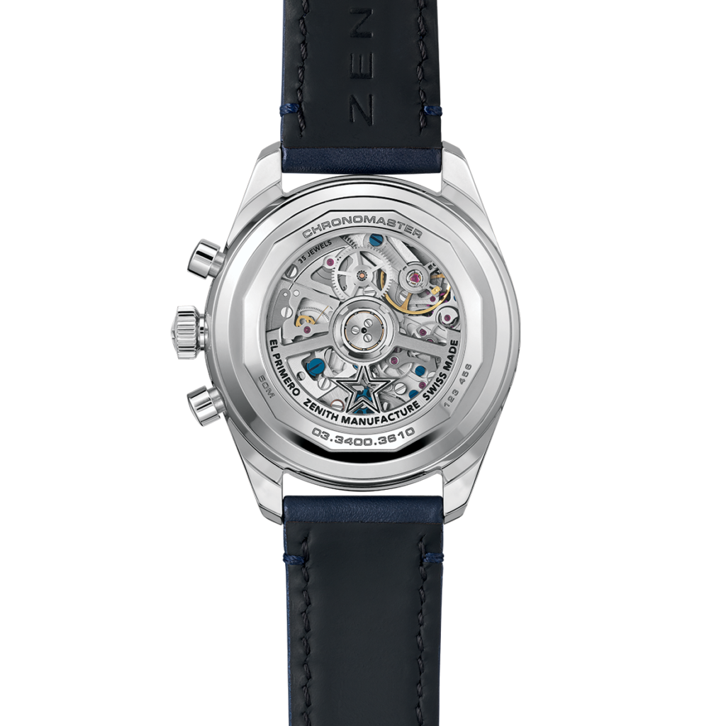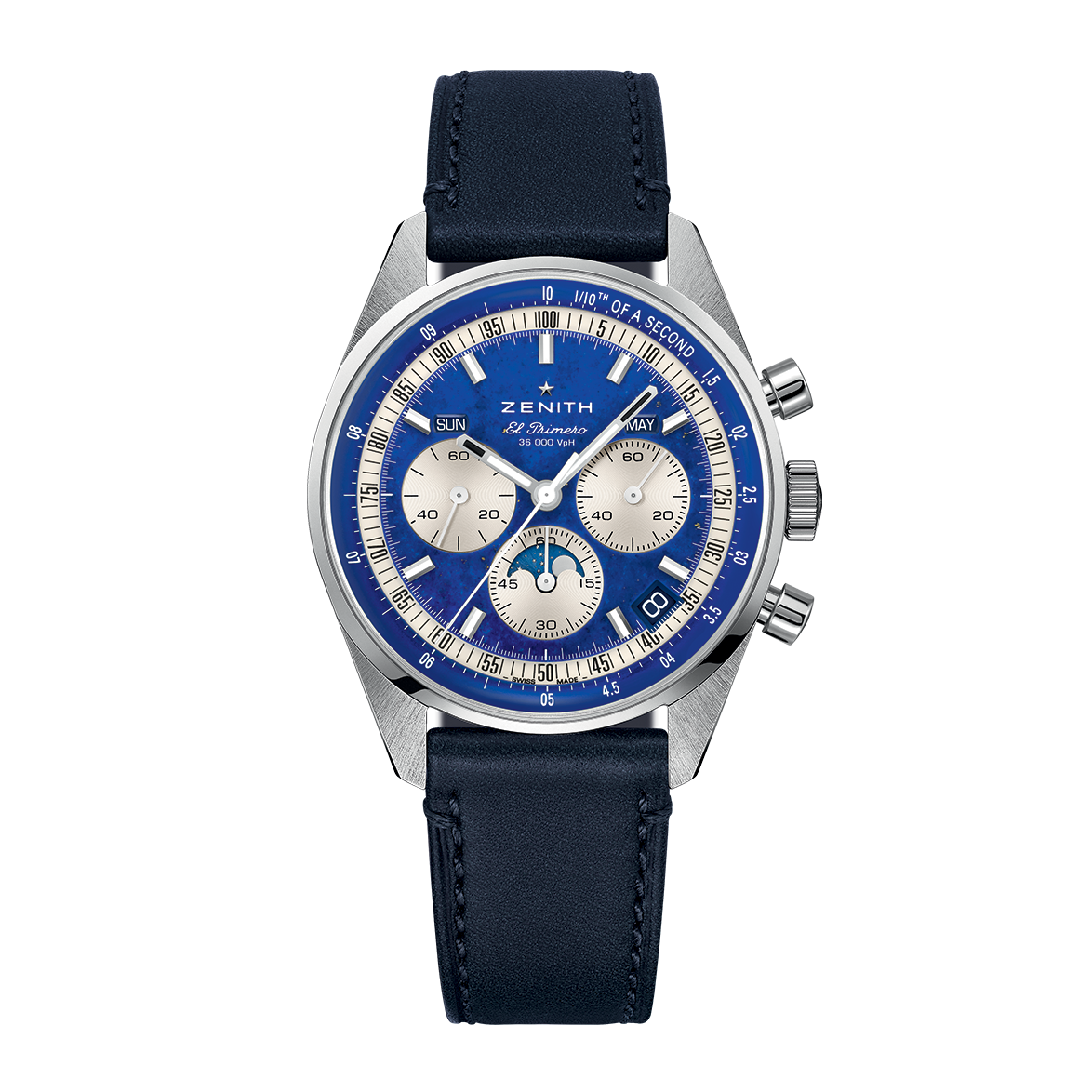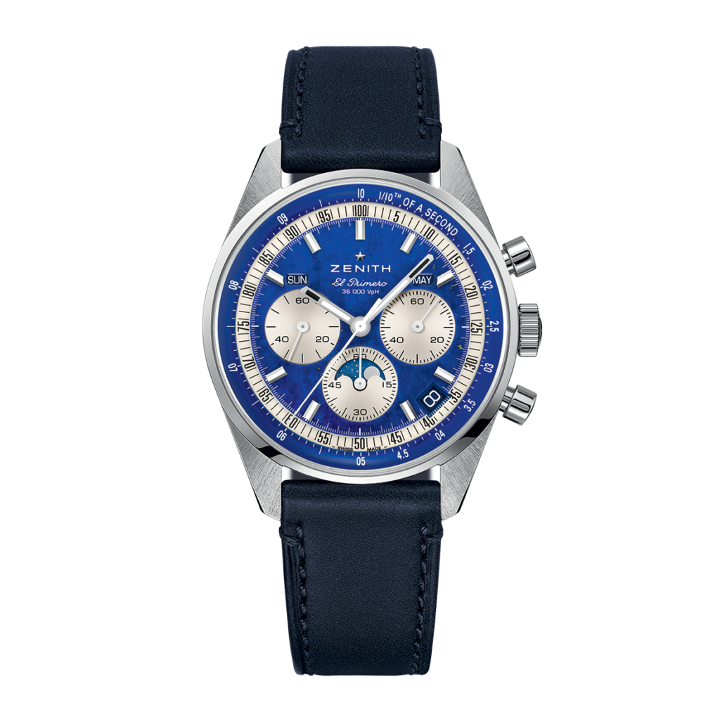The CHRONOMASTER Original Triple Calendar is crafted in a 38mm steel case and comes with both a blue calfskin strap and a steel bracelet. Its elegant Lapis Lazuli dial features silver-coloured counters. It is powered by the El Primero 3610 automatic high-frequency movement with a 1/10th of a second chronograph function, combined with day, date, month and moonphase indications.