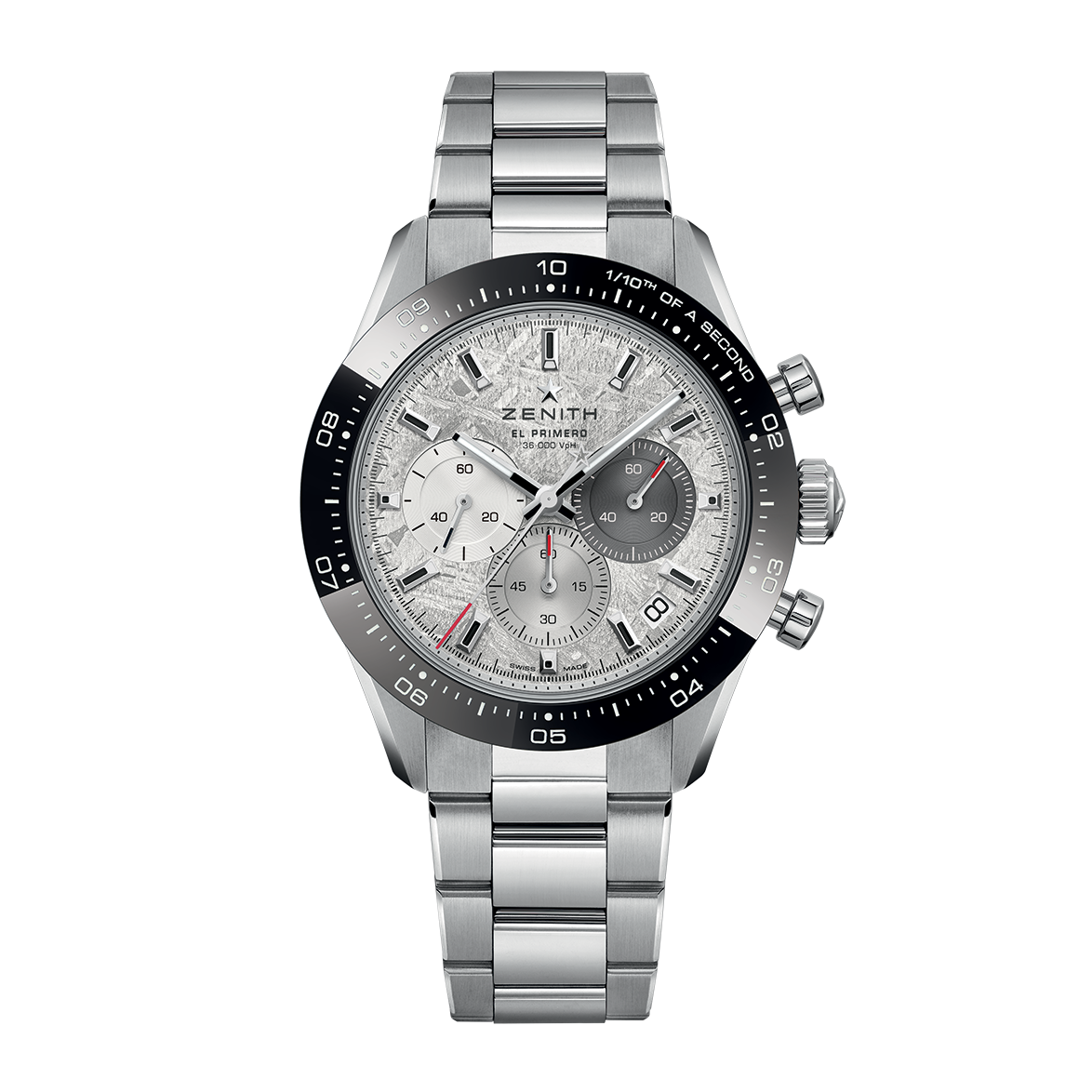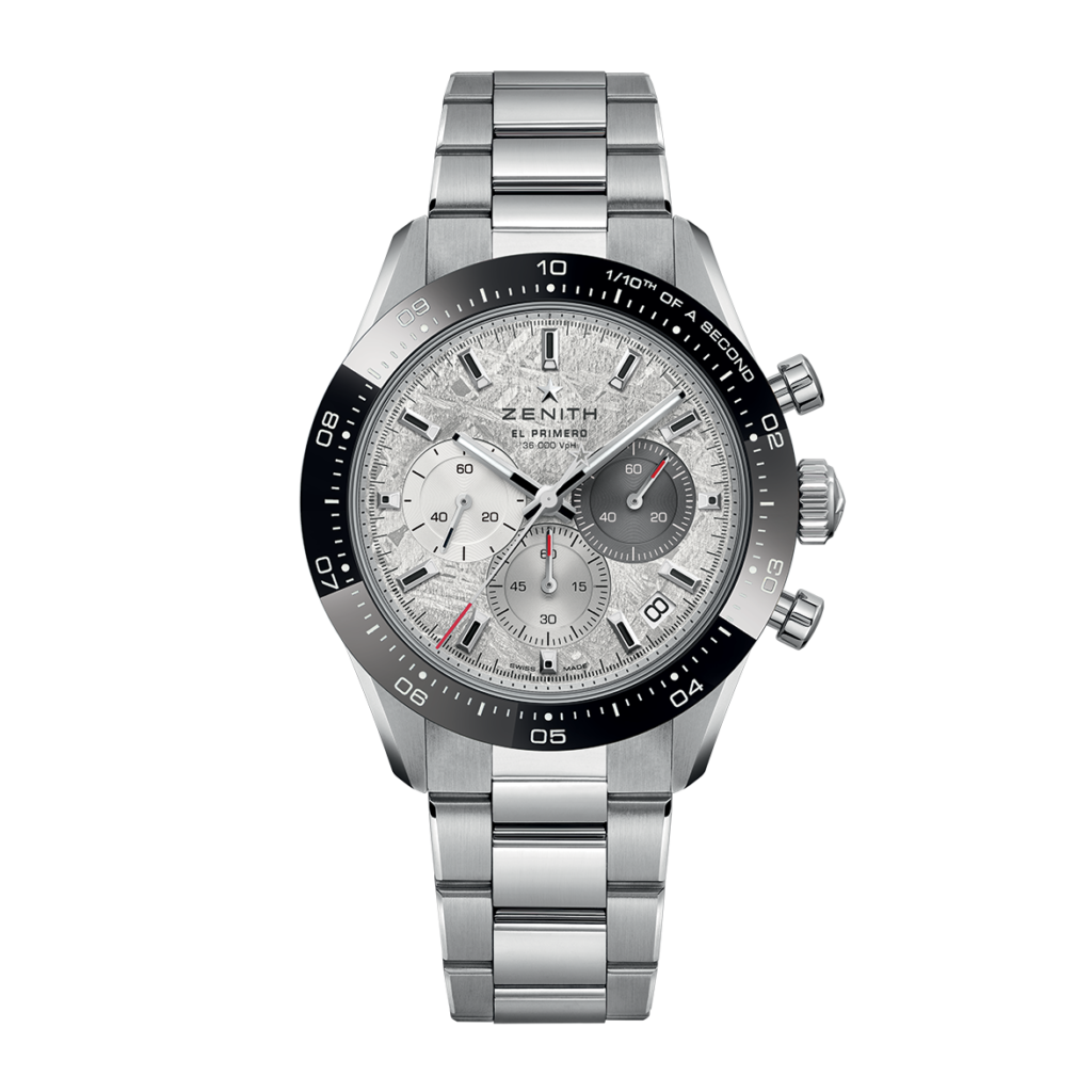 The CHRONOMASTER Sport is crafted in a 41mm stainless steel case with a ceramic bezel. Its meteorite dial features the brand’s signature 3-6-9 tricolour overlapping counters. Powered by the El Primero 3600 automatic high-frequency chronograph movement with a 1/10th of a second chronograph function, it provides a power reserve of 60 hours. It is delivered with a steel bracelet and an additional black rubber strap.