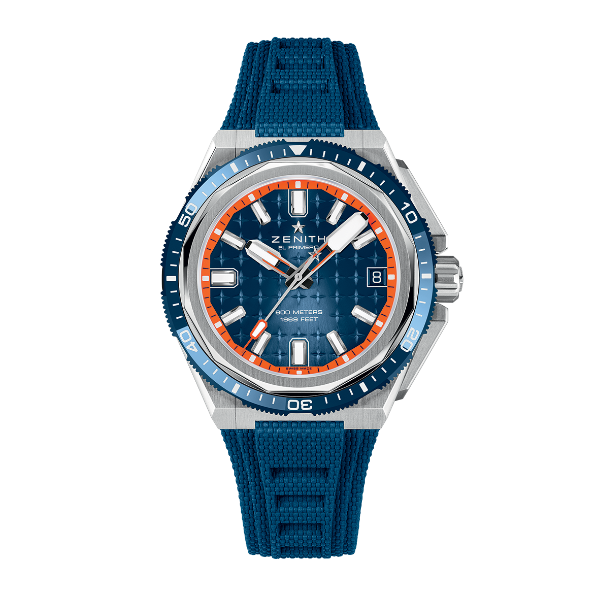 The DEFY Extreme Diver in a 42.5mm angular case is crafted in titanium, equipped with a rotating blue ceramic bezel and helium escape valve with a water-resistance of 600 metres. It features a blue star-patterned dial with luminescent markers and hands. Powering the watch is the El Primero 3620 SC automatic movement, providing a 60-hour power reserve.