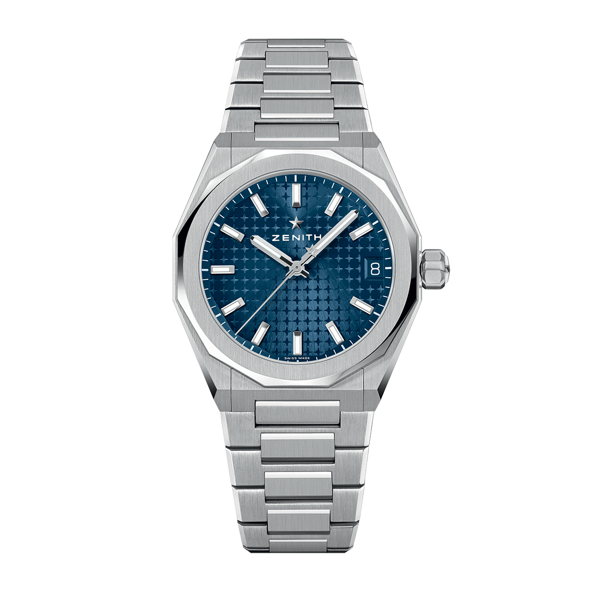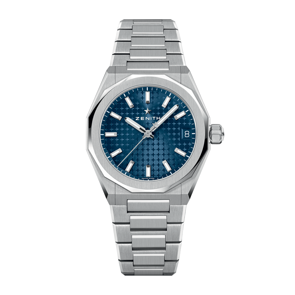 The DEFY Skyline is crafted in a 36mm steel octagonal case with a faceted bezel, featuring a blue sunburst-patterned dial revisiting the emblematic ZENITH four-pointed star. It is powered by the Elite 670 automatic manufacture movement. Delivered with a steel bracelet, it also includes a blue patterned rubber strap, offering effortless interchangeability.