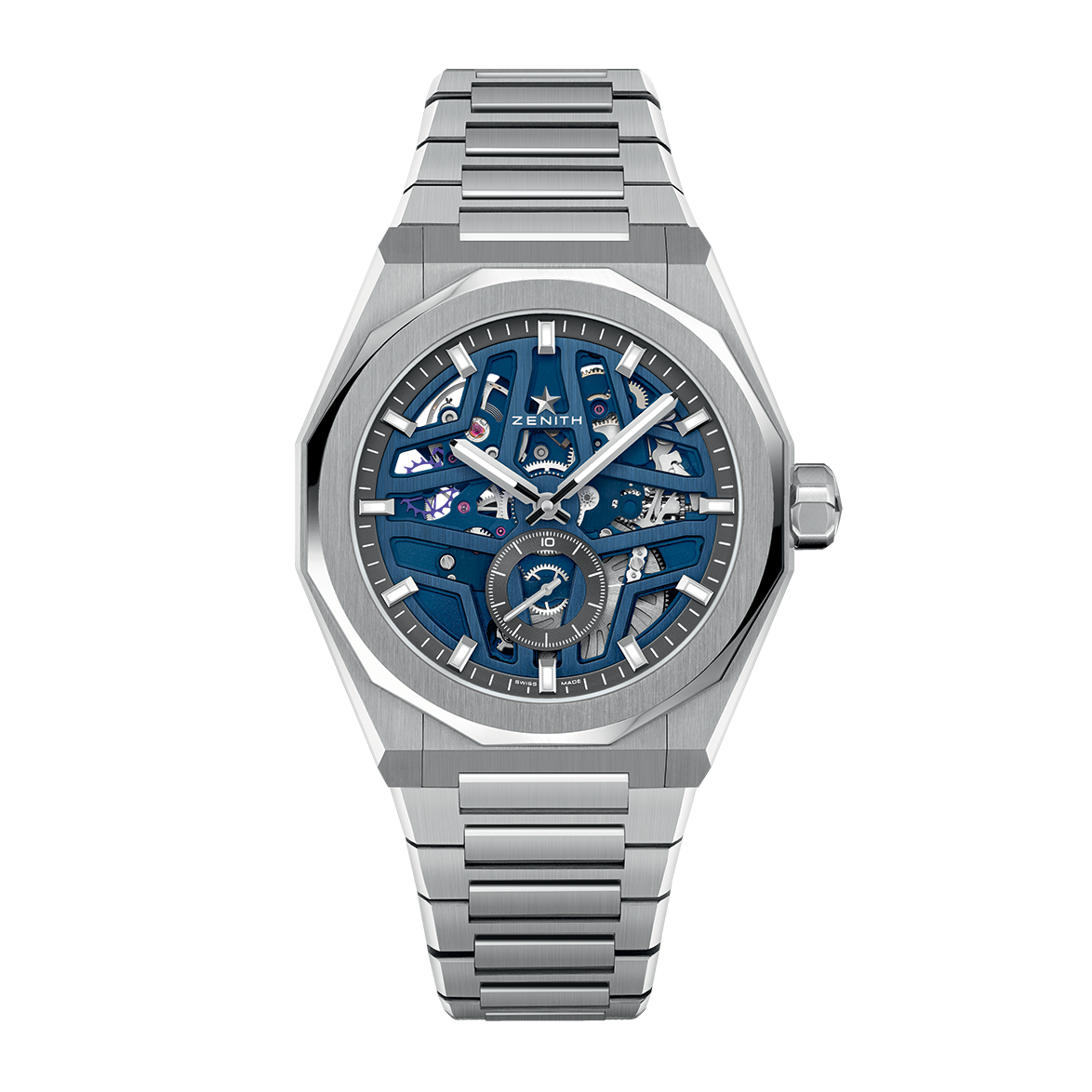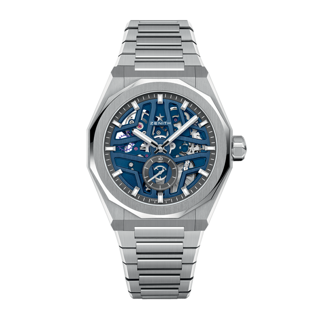 The DEFY Skyline Skeleton is crafted in a 41mm steel octagonal case with a faceted bezel, featuring a blue open dial revisiting the emblematic ZENITH four-pointed star. It is powered by the El Primero 3620 SK high-frequency automatic manufacture skeleton movement with the very first 1/10th of a second indicator.
