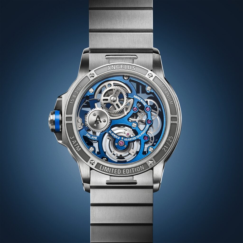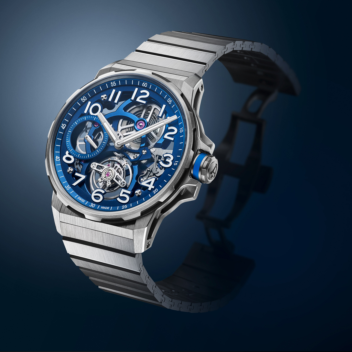 The Flying Tourbillon Titanium Blue features a 42.5mm multi-material case made from titanium and carbon composite. Its skeletonised design displays blue PVD-treated bridges and a flying tourbillon at 6 o’clock with a 160° angled carriage. Large Arabic numerals, filled with Super-LumiNova, float above. Powered by the in-house A-310 calibre with a 60-hour power reserve. Limited to 25 pieces.