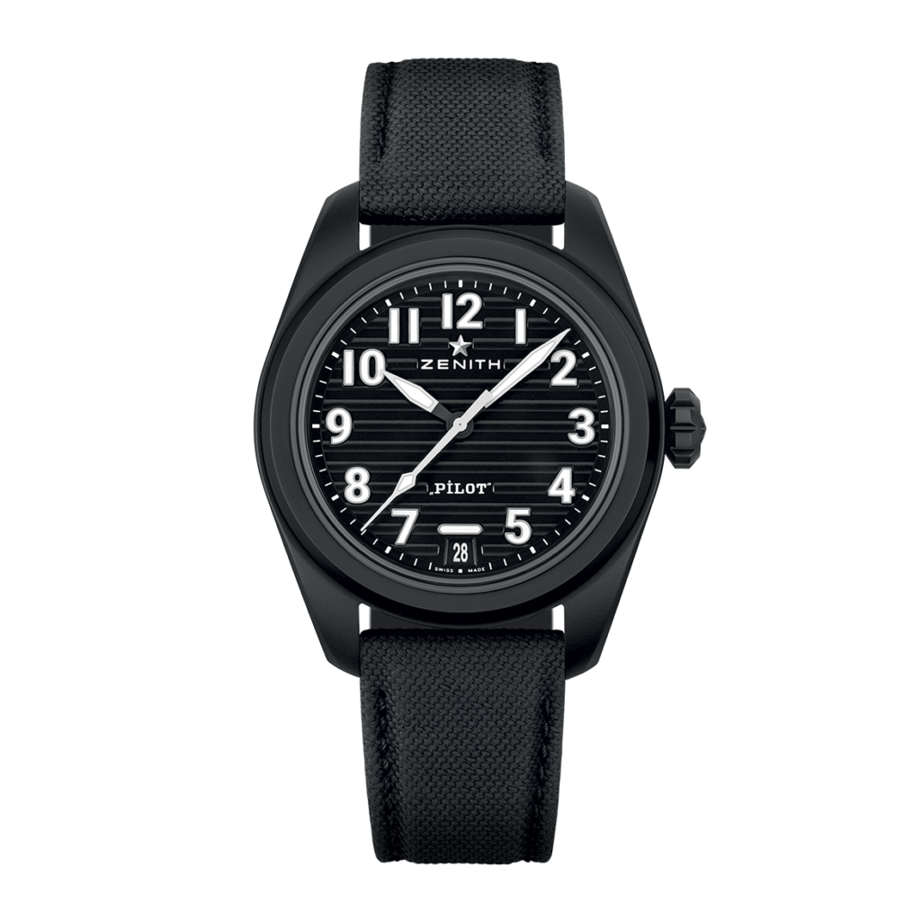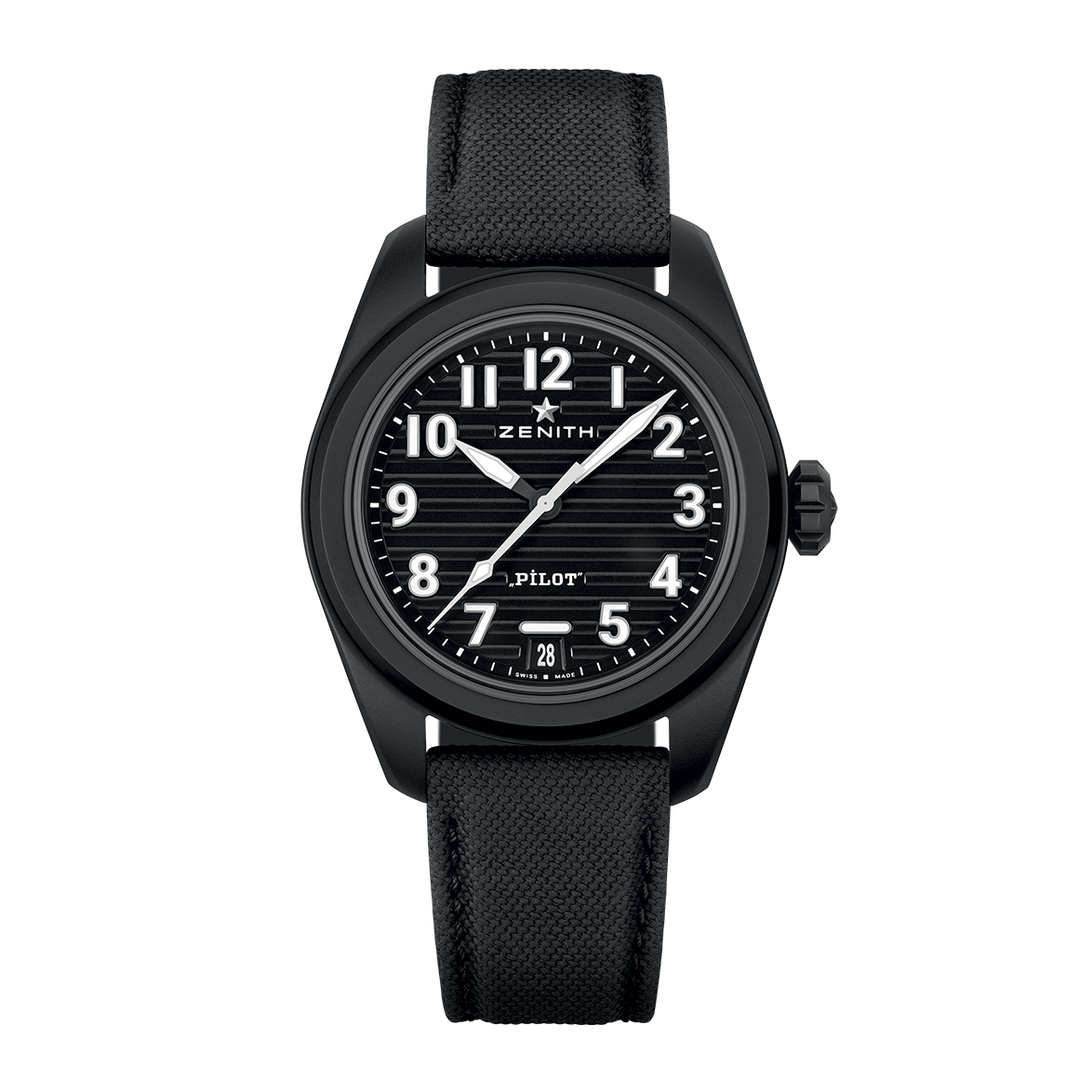 The PILOT Automatic watch is crafted in a 40mm black ceramic case with an oversized crown, paired with a black corrugated dial featuring large luminescent Arabic numerals. It is delivered with interchangeable black and khaki Cordura-effect rubber straps. Powering the watch is the El Primero 3620 automatic high-frequency manufacture movement.
