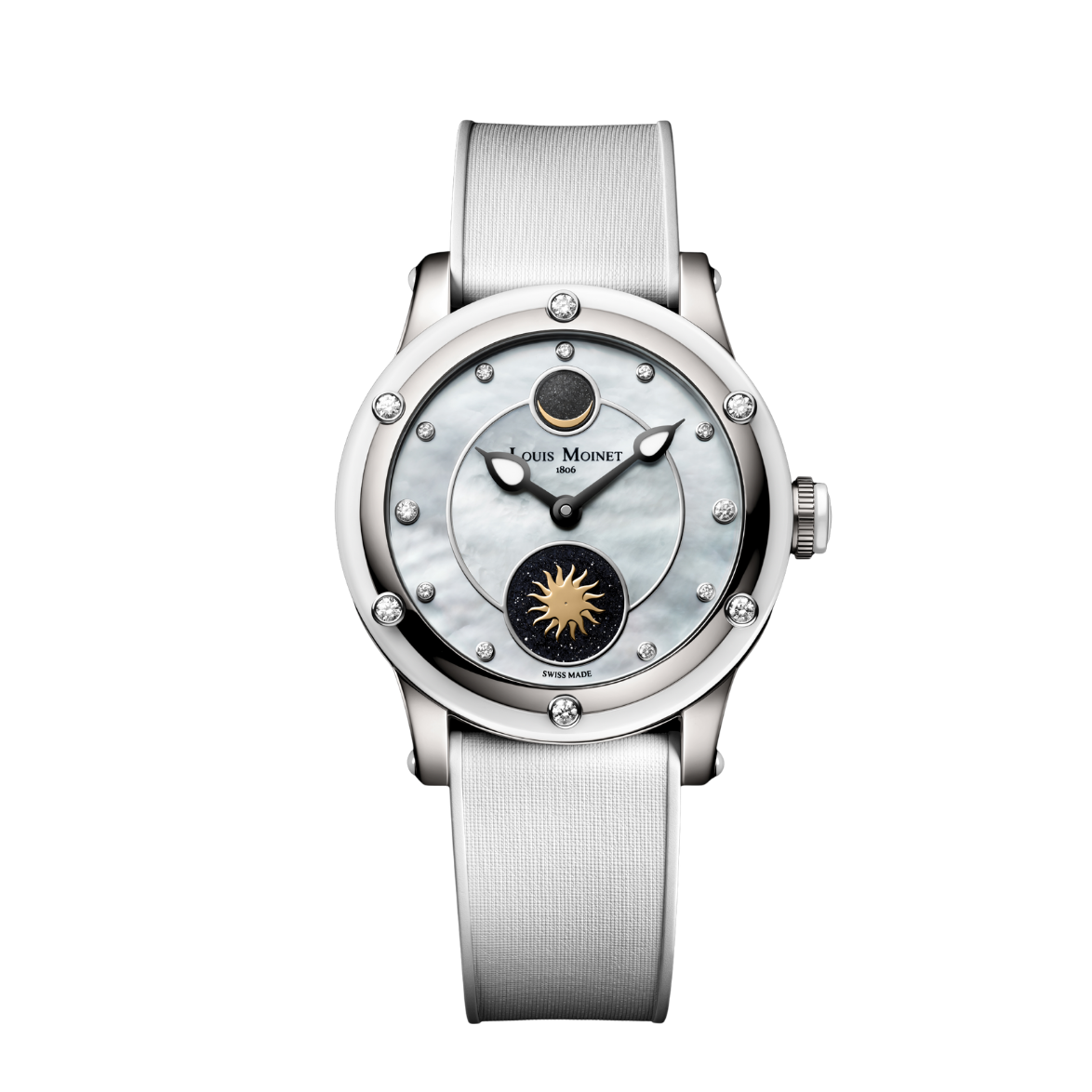 Set against a white mother-of-pearl dial, eleven diamonds mark the hours. The Moon appears as a golden crescent against a fragment of genuine lunar meteorite, Dhofar 457, that once landed on Earth. Opposite, the Sun radiates over a shimmering aventurine sky, brought to life through two superimposed discs, one fixed and one in motion, creating a continuous interplay of light and movement.