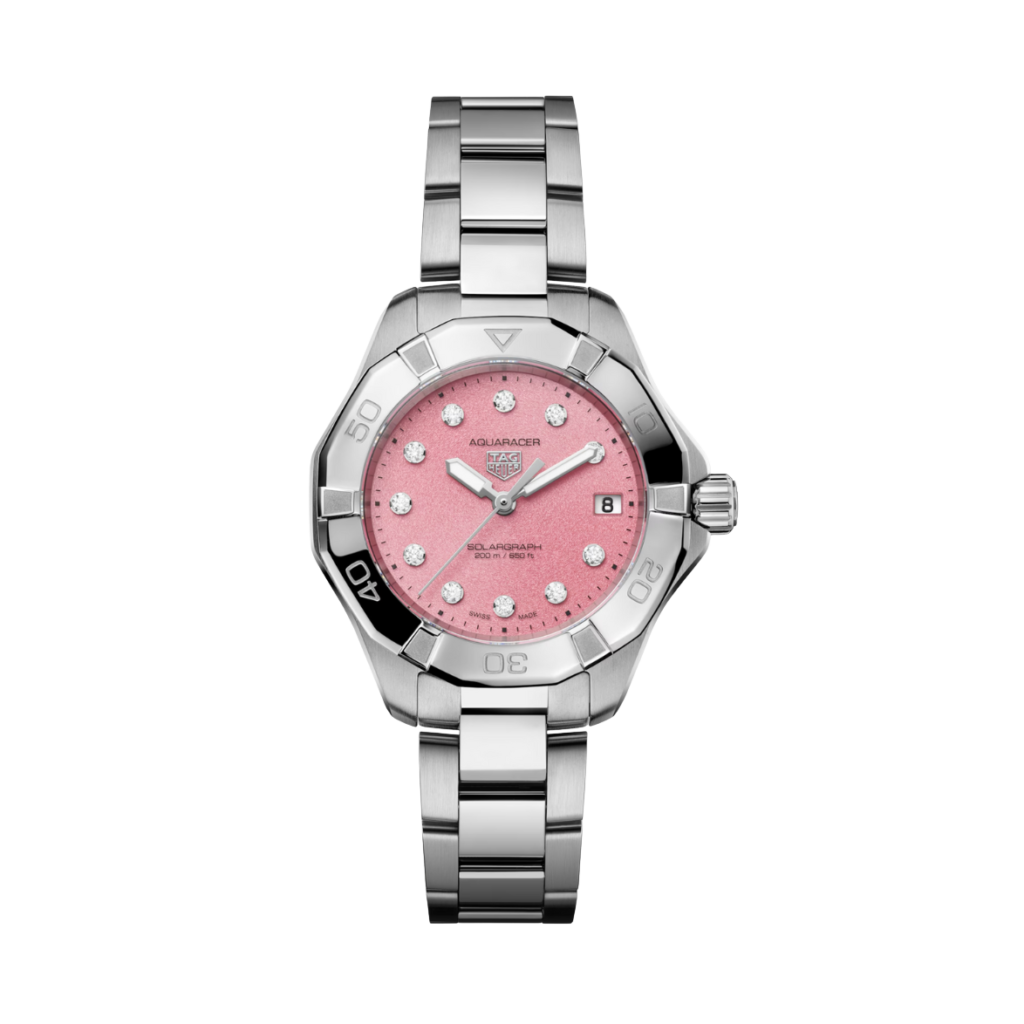 The TAG Heuer Aquaracer Professional 200 Solargraph merges elegance and performance, offering a refined take on the Maison’s versatile tool watch. The pink dial, adorned with diamond indices, evokes the ethereal beauty of the northern lights, celebrating exploration in style.