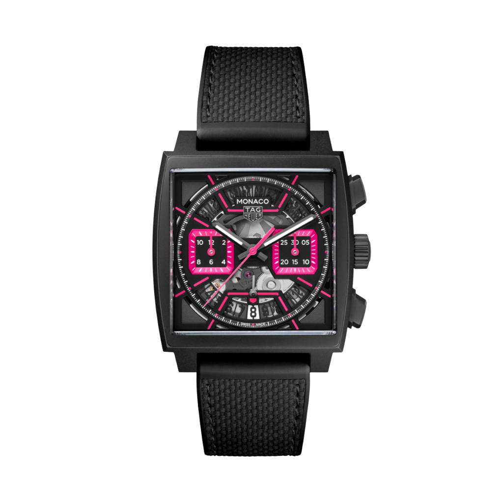 Step into a world of bold innovation with this avant-garde TAG Heuer Monaco. A contemporary twist on a classic, this timepiece pairs vibrant pink with sleek black in a striking skeletonised design, embodying the daring spirit of today’s trailblazers.