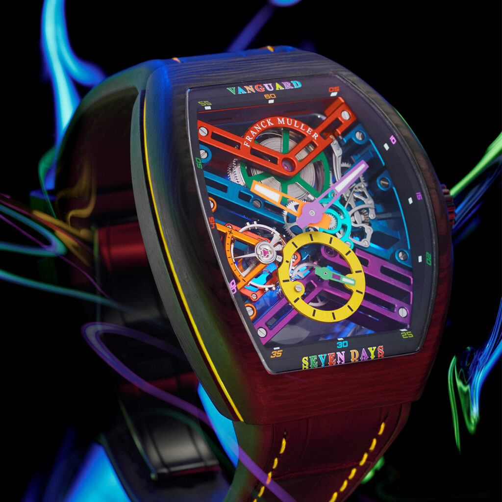 The V43 Vanguard Skeleton Color Dreams features the brand’s signature psychedelic dials. Satin-finished, anodised aluminium bridges are secured to the lightweight Carbotech case, precisely machined to follow its curves. Architectural design meets vivid pop colours, from a fiery red barrel bridge to a marigold yellow small seconds counter at 6 o’clock.