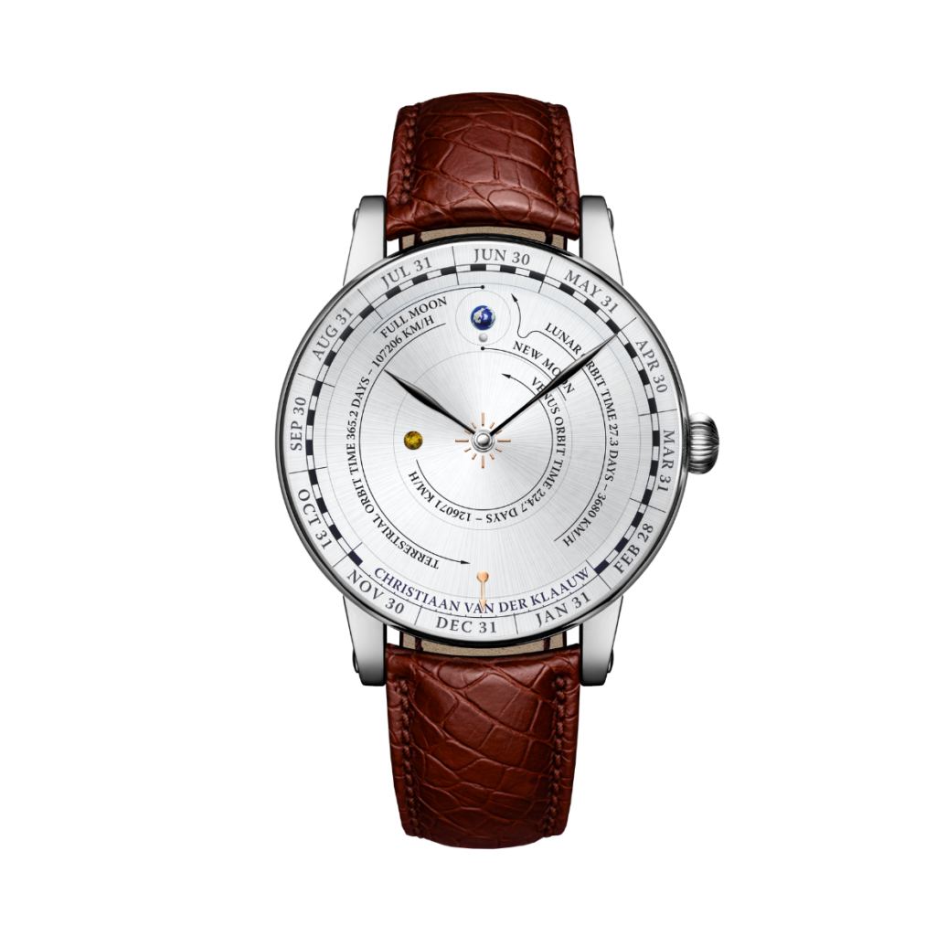 The Venus Annual Calendar is powered by the in-house CKM-01 movement, enhanced with a newly developed astronomical Venus module. Its dial is composed of four separate discs, three of which rotate to carry the celestial bodies — Venus, Earth and the Moon — displaying their real-time positions and orbits in a miniature planetarium. Set against a refined sunray-finished dial, an outer ring indicates the days of the month in a black and white railway track segmented by each month. Requiring only one correction every four years, all adjustments can be made conveniently via the crown.